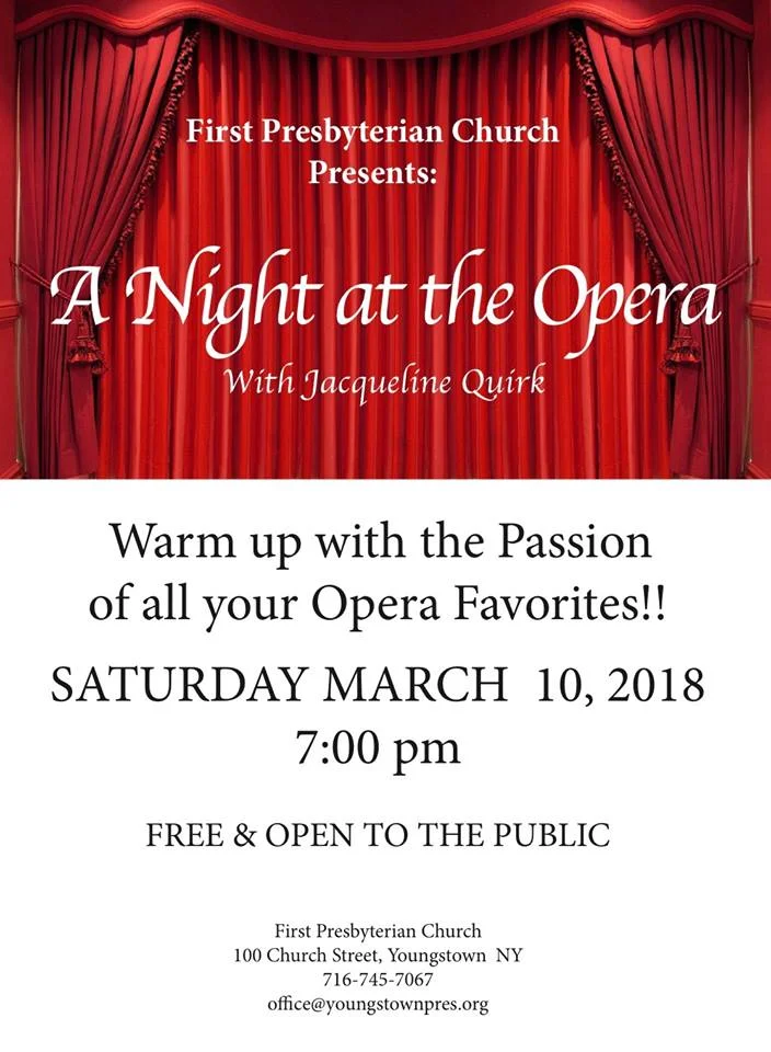 First Presbyterian Church of Youngstown presents A Night At The Opera and More with Jacqueline Quirk! Hear your favorites from operas, art songs, spirituals, musical theatre and more - featured artists like myself from Ms. Quirk's studio will also be showcased. Antonella Di Giulio, accompanist. Free and open to the general public ~ reception to follow. Here's the Facebook invite.